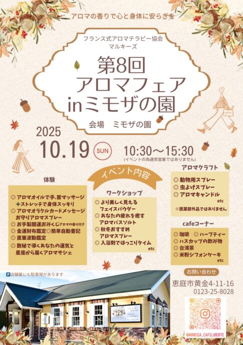 10月19日(日)恵庭市にあるカフェミモザにてアロマイベントにでます 当日はアドバイザーの皆がそれぞれ素敵なお店を出店します 薫りんもアドバイザーなんです(*’ω’*) 普段のセッションよりリーズ...